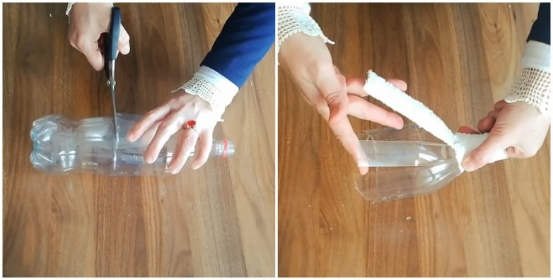Основой каркаса станет верхняя часть пластиковой бутылки. Подравняв бутылку по линии обрезки, делаем глубокие надрезы, чтобы получить одинаковые по ширине полосы. Прорезы оканчиваются чуть ниже горлышка, а значит полосы к верху будут сужаться. Для удобства прежде чем разрезать бутылку можно сделать разметку, проставив сверху и снизу точки при помощи маркера.