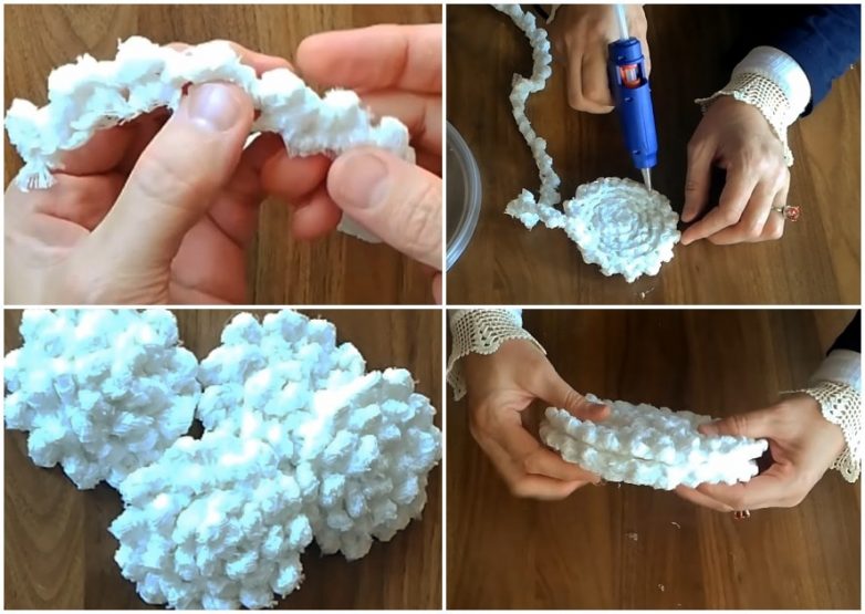Из полученного пушистого шнура формируем круги 2-х размеров. Для этого просто скручиваем шнур в улитку с проклейкой между витками. Количество маленьких кругов соответствует количеству «лепестков». 2 больших круга станут основанием, их необходимо склеить между собой тыльными сторонами внутрь.