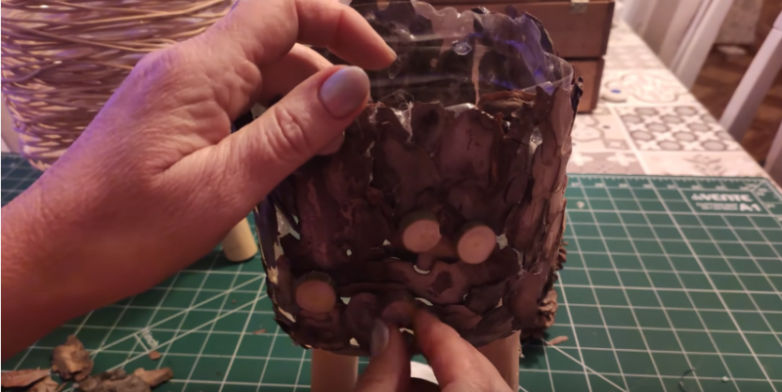 Для оформления второго кашпо используем кору дерева. Ее просто приклеиваем по всей поверхности встык а также с небольшим наслоением кусочков друг на друга. Довершаем декор небольшими круглыми спилами с ветки.