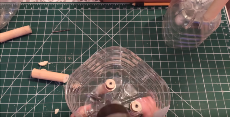 Ножки можно просто приклеить к основанию, а можно прикрепить с помощью самореза и среза ветки, расположив последний с внутренней стороны дна бутылки.