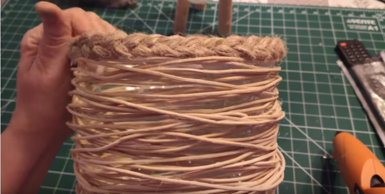 В качестве дополнительного декоративного элемента по верхнему краю кашпо приклеиваем косичку из джута.