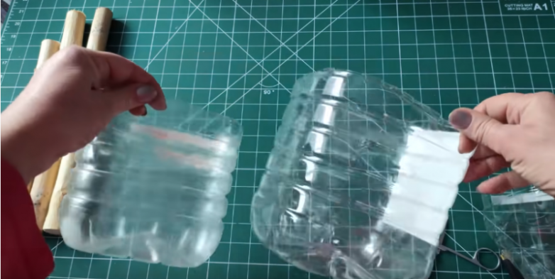 У бутылок отрезаем верхнюю часть с горлышком, оставляя низ с желаемой для кашпо высотой. Все этикетки также убираем.