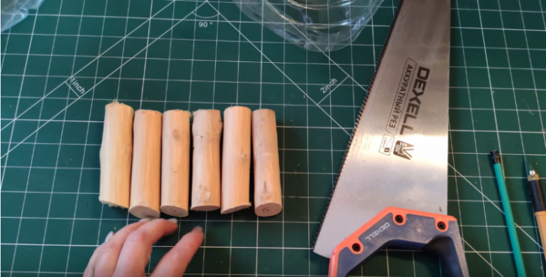 Затем подготавливаем для кашпо ножки, для этого можно использовать уже готовые мебельные ножки, черенки для садового инструмента или как в нашем случае просто ошкуренные ветки необходимой толщины. Высота наших ножек — 12 см, а их количество — по 3 на каждое кашпо.