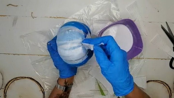 После того, как заготовка будет покрыта несколькими слоями бумаги (пробелов быть не должно), оставляем её до полного просыхания, а затем прокалываем шарик и извлекаем его вместе с бечёвкой.