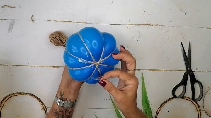 Несильно надутый воздушный шарик перетяните шпагатом, придавая ему сходство с тыквой. Для удобства витки можно фиксировать при помощи кусочков скотча.