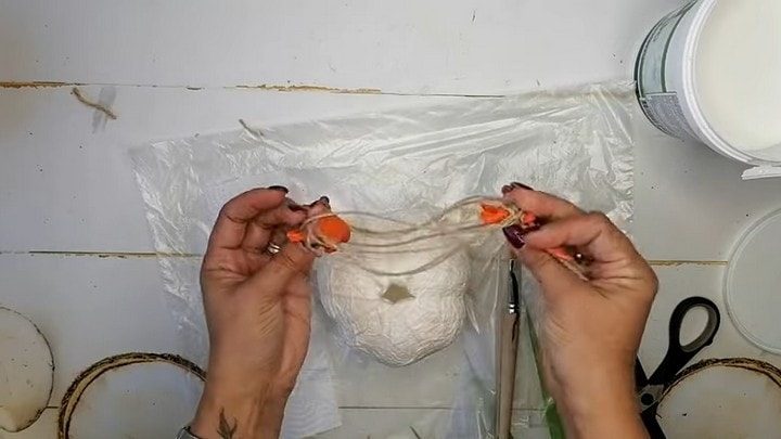 Клей ПВА разводим водой 1:1 и нарезаем на полоски бумажные полотенца. Макаем кусочек за кусочком бумагу в клеевой раствор и прикладываем к будущей тыковке.