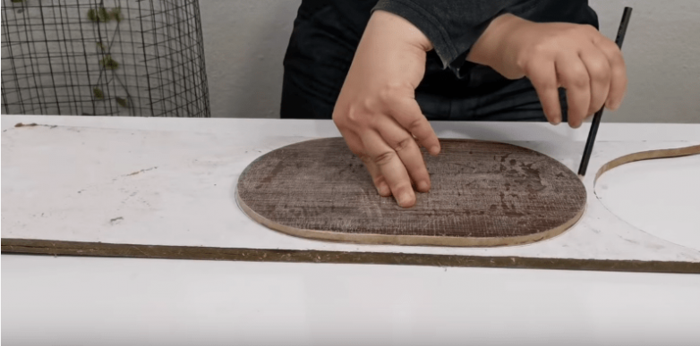 Вырезаем из фанеры или доски деталь нужного размера и формы. В нашем случае форма корзины овальная и чтобы подготовить овальное дно, можно взять подходящую по диаметру тарелку и обвести ее дважды с небольшим промежутком.