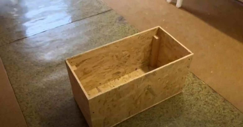 Далее вырезаем из листа OSB дно, и прикручиваем его к нижней части получившегося короба. Теперь у нас уже не короб, а полноценный ящик.