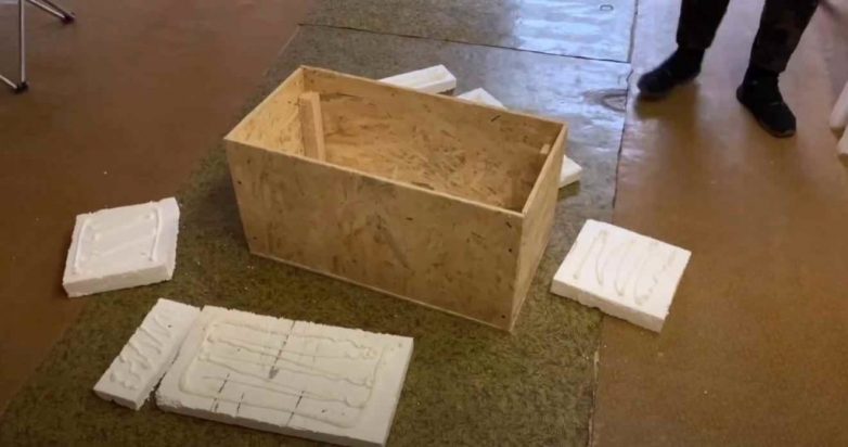 На следующем этапе обшиваем внутреннюю часть ящика вырезанными по размеру кусочками пенопласта. Если есть возможность, лучше использовать экструдированный пенополистирол. Приклеиваем пенопласт к стенкам с помощью клей-пены.