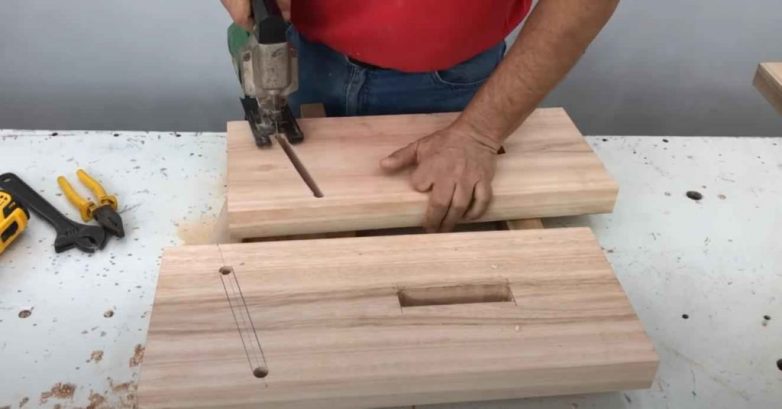 На следующем этапе отпиливаем еще две доски. Вырезаем в них пазы и шипы, после чего собираем соединительную Т-образную перекладину.