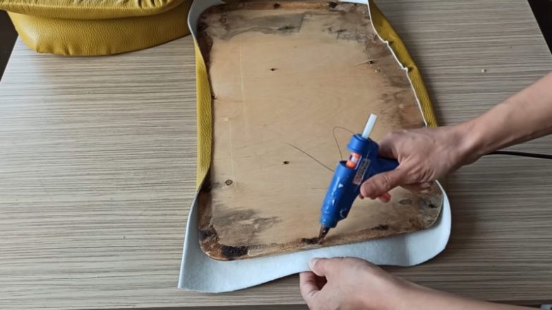 Для оформления задней части спинки стула потребуется горячий клей. Приклейте обивочную ткань к фанере. Излишки эко кожи обрежьте.