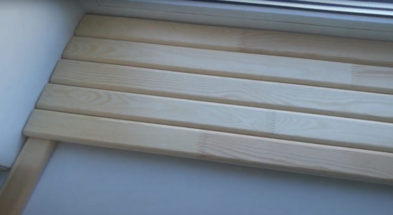 Сверху на трех коротких рейках разложите длинные рейки, длина которых соответствует длине подоконника. Для фиксации продольных реек на трех поперечных можно использовать шурупы или термоклей.