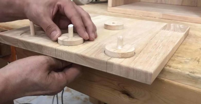 Обрабатываем их на шлифстанке, вклеиваем шканты, а затем вставляем в отверстия в дверце.