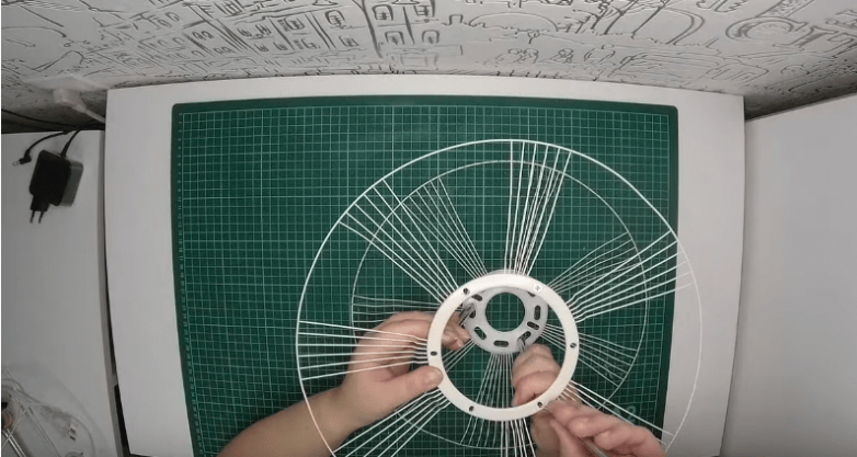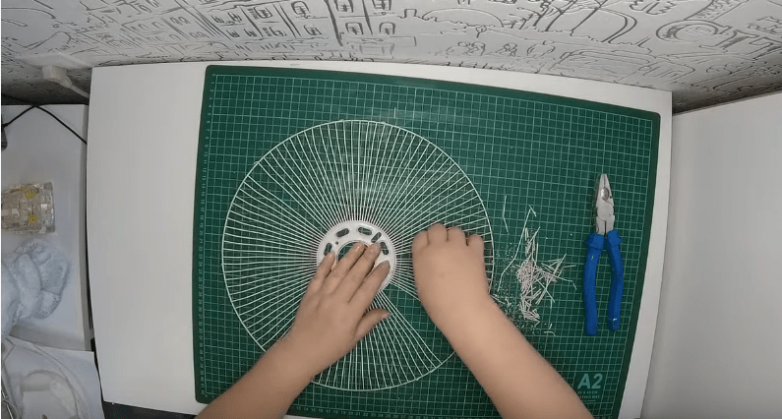 В это время подготовим абажур для будущего торшера. В нашем случае в качестве материала для каркаса используется защитный экран вентилятора. С помощью плоскогубцев убираем с решетки все лишние прутья и верхняя и нижняя части каркаса готовы. Также для этих деталей каркаса можно использовать пяльцы или деревянные шпажки, правда тогда абажур не будет круглым.