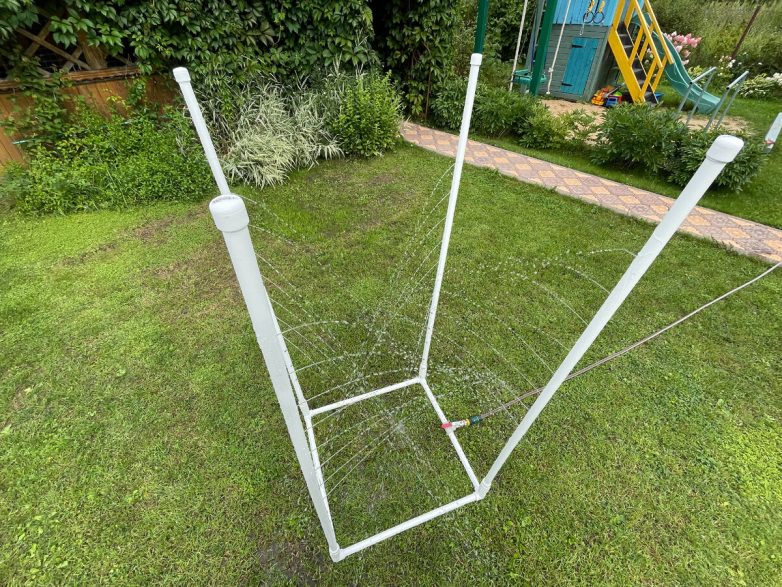 Можно конструкцию сделать такой, чтобы подача воды была сверху – в этом случае добавляем отверстия в верхних горизонтальных трубах. Но, опять же, делайте это с оглядкой на напор воды, которым вы располагаете, при такой конструкции он должен быть сильнее, чем в первом варианте. Иначе при нехватке напора струи воды будут бить неравномерно.