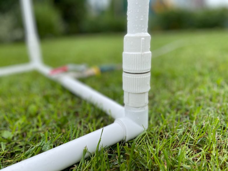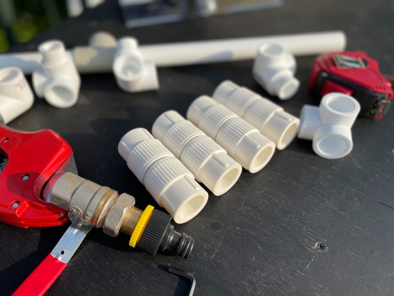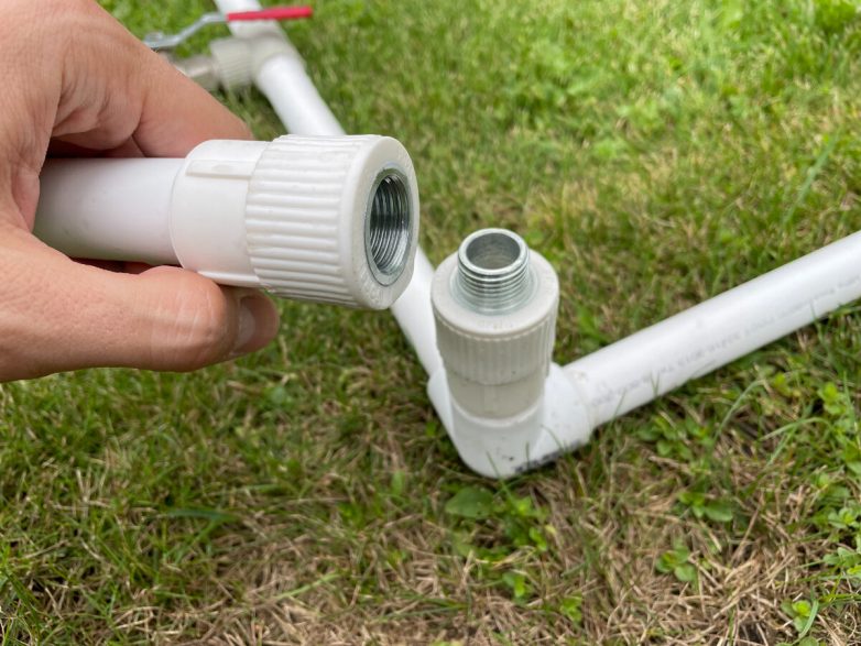 Я решил сделать всю конструкцию разборной, чтобы можно было в конце сезона разобрать и удобно хранить. Для этого я использовал комбинированные фитинги с резьбой, на них буду устанавливать вертикальные стойки.