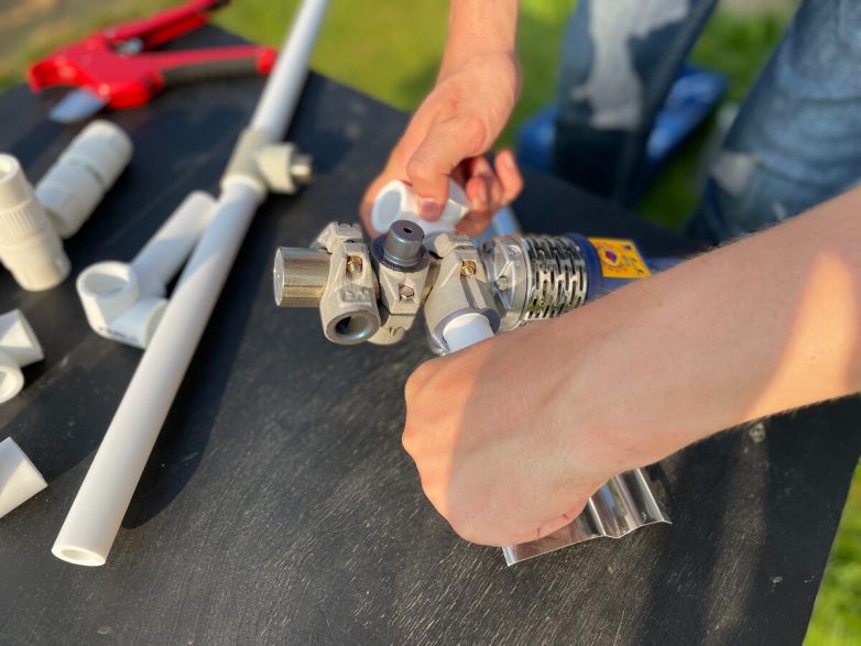 Видите, я закрутил комбинированные фитинги. Теперь – важный нюанс. Сейчас нужно просверлить отверстия в вертикальных трубах и только потом их припаивать нужной стороной к основанию. Иначе вы можете не угадать с направлением струй воды.