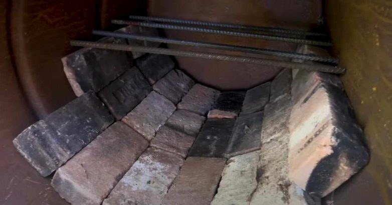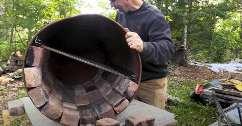 Переворачиваем бочку, чтобы купол из кирпичей оказался в верхней части. На решетку из арматуры тоже укладываем кирпич. Самодельная печка готова!