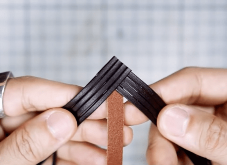 Для плетения понадобится разделить шнур на 8 частей, ориентировочная длина каждого отрезка равна 40 см, при условии, что обхват запястья равен 19 см. Собираем в пучки по 4 шнура, подгоняем край под один уровень. Располагаем оба пучка на вспомогательной полосе внахлест так, чтобы на стыке образовался прямой угол. Чтобы зафиксировать начало работы, проклеиваем шнуры.
