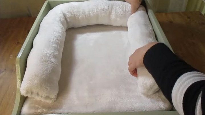 Теперь необходимо сшить подушку и бортик. Вырезаем квадрат(прямоугольник) нужного размера из поролона. Подбираем мягкую уютную пушистую ткань. Кладём на её лицевую часть заготовку из поролона и собираем ткань по углам, формируя чехол.