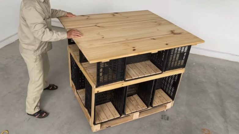 К паллете с обратной стороны прикрепить либо четыре ножки (мебельная опора), либо четыре мебельных колеса. Сверху расставьте пластиковые ящики, как показано на фото выше. Ещё одну паллету разберите на доски, нарежьте их и прикрепите на саморезы к паллете.