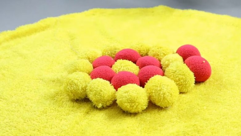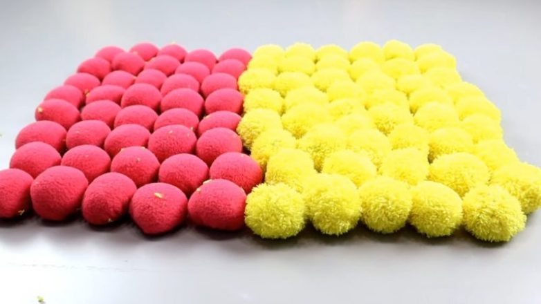 На плюшевую ткань прикрепите шарики-помпоны. Лучше всего прошивать вручную, чтобы они крепко держались.