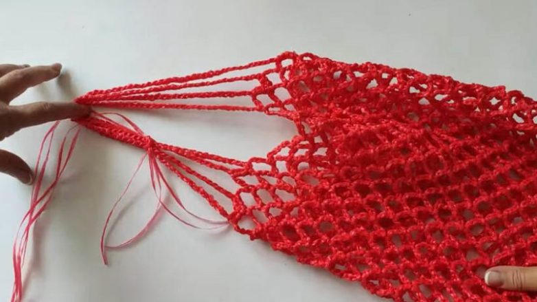 Чтобы связать ручки, просто наберите достаточно длинную воздушную цепочку и присоедините с другой стороны. Сделайте 4 цепочки и соедините их вместе сверху, провязав нитью посередине. Стильная продуктовая авоська готова!