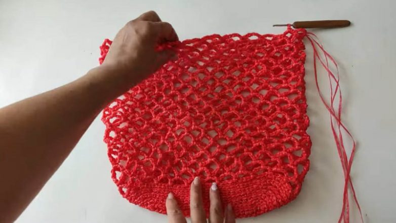 Из верёвки набрать 15 воздушных столбиков крючком. Теперь обвязывать цепочку по кругу, на поворотах добавляя петли, тем самым, формируя овальное дно сумки.
