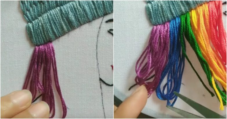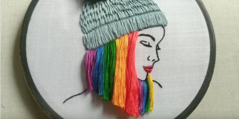 Конечно, сделать вышивку можно и самостоятельно, к тому же практически на любой ткани, а значит и вещи. Даже если вы абсолютный новичок, есть множество техник и рисунков, с которых можно начать, причем выглядят они очень достойно. Например, вышивка вот такой девушки с радужными волосами под силу каждому.