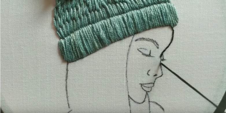 Начнем с верхней части шапки, ее вышиваем цепным стежком: первый стежок делаем с лица на изнанку, после чего с изнанки игла должна войти в середину предыдущего стежка, тем самым разделив его надвое. Таким образом ряд за рядом заполняем всю верхнюю часть шапки.