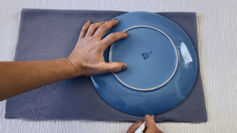 Сложив ткань вдвое лицом внутрь, отмеряем от внешнего угла по 13 см в обе стороны и ставим метки. Берем подходящую по размеру тарелку, размещаем ее так, чтобы края совпали с метками, а затем делаем обводку. Воспользоваться для этих целей можно и лекалом или трафаретом.