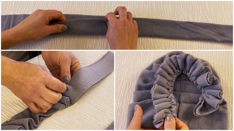 Отрезаем широкую длинную полосу (150 см х 11 см) и складываем ее вдвое во всю длину. Прочной ниткой прокладываем наметочный шов по внутреннему краю, одновременно присобирая ткань. Получаем широкую флисовую рюшу. Сборку делаем с таким расчетом, чтобы рюша равномерно легла вдоль шва. Дальше остается только пришить рюшу к шапке и примерить обновку.