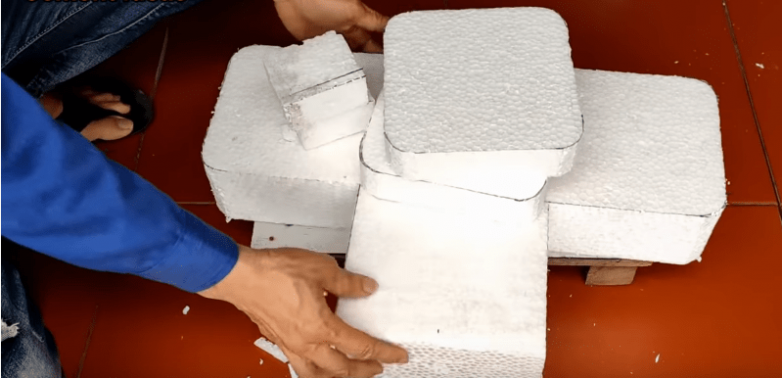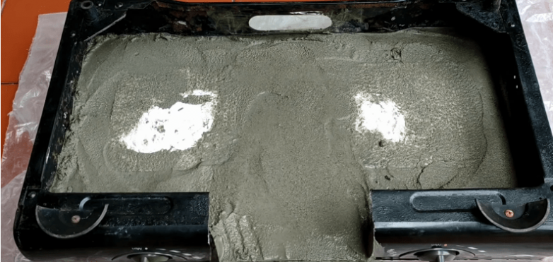 Затем из пенопласта или иного схожего материала нужно вырезать формы, которые понадобятся при формировании внутренней части корпуса во время заливки. Вам потребуются 2 детали повторяющие форму конфорок, Т-образная деталь, немного меньше корпуса, 2 заглушки для поддувала, а также рамка с размером примерно таким же, как и корпус плиты.