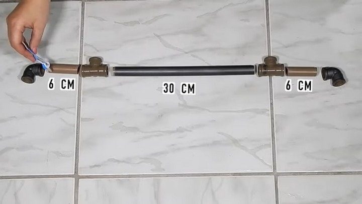 Деталь № 3 состоит из одного обрезка 30 см и двух обрезков по 6 см, также понадобятся два тройника и два угловых соединения. Внимание! Таких деталей нужно две штуки.