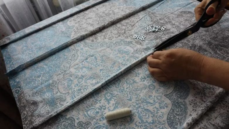 Замерьте окно, перенесите на ткань, вырежьте с припусками на швы. Разметьте ткань на части, расстояние между которыми — примерно 20 см. Подогните и сшейте на машинке канавки для реек (деревянные круглые планки, которые можно найти в любом строительном магазине).