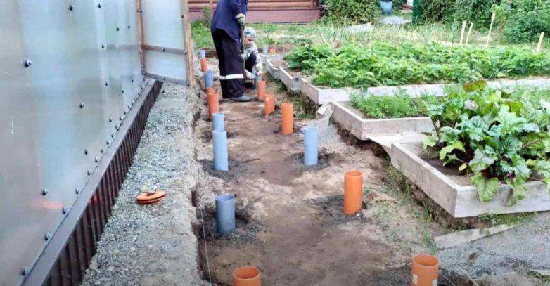 В подготовленные лунки вставляем отрезки пластиковой трубы. Засыпаем их мелким щебнем или отсевом. Верхнюю часть труб обрезаем по уровню.