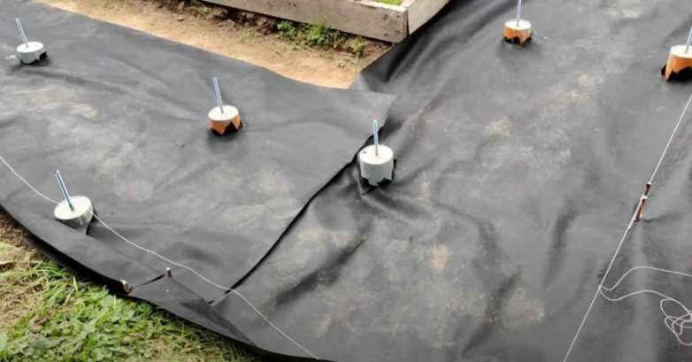 Расстилаем геотекстиль. Сверху геотекстиля высыпаем песок. Разравниваем его по уровню.