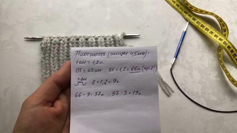 Рассчитать схему для шапки очень просто. Нужно связать образец вашей пряжей, измерить, сколько петель получается в 1 см (плотность пряжи и вязания). Теперь полученное число умножить на охват головы. В данном случае это 66 петель (обязательно должно быть кратно 2). Для затылочной части берётся примерно 7-8 см. Умножаем на плотность пряжи в 1 см, получаем 9 петель — это количество петель пойдёт для затылка. Вычитаем его из общего количества (66), получаем 57 — это количество петель для оставшихся трёх деталей шапки: передняя и боковые. Делим число на 3, так как все три части будут равными, получаем 19 петель для каждой детали. Именно столько и набираем спицами. Сначала вяжем ушки.