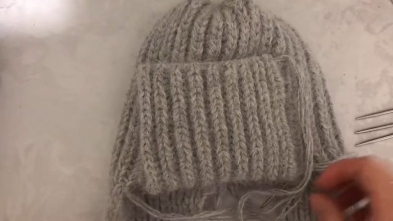 Остаётся только вывязать затылочную часть из 9 петель, как было подсчитано вначале. Здесь также набирается первый ряд резинкой, затем — фабричный наборный край, далее — один ряд пышной резинки. Теперь присоединяем первую деталь ушек к изнанке и вяжем вместе, замыкая в круг.