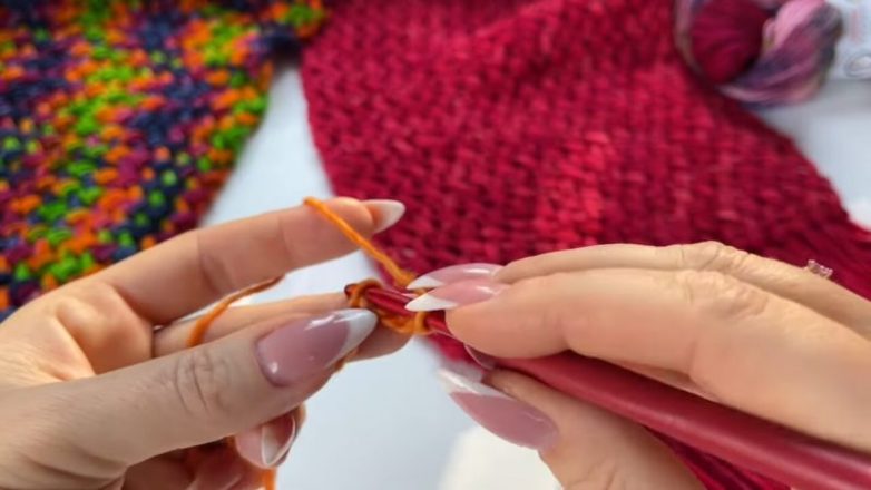 Этот узор совсем простой, но из-за сочетания с красивой пряжей получается шарфик, от которого не отвести взгляд. Конечно, таким мозаичным узором можно связать не только шарф, а любое изделие.