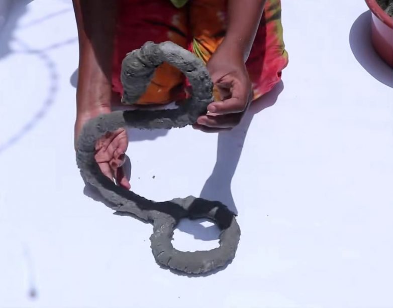 Пропитайте тонкие длинные полоски ткани тем же цементным раствором, оберните ими проволоку. Оставьте на сутки высохнуть вместе с первой частью поделки.