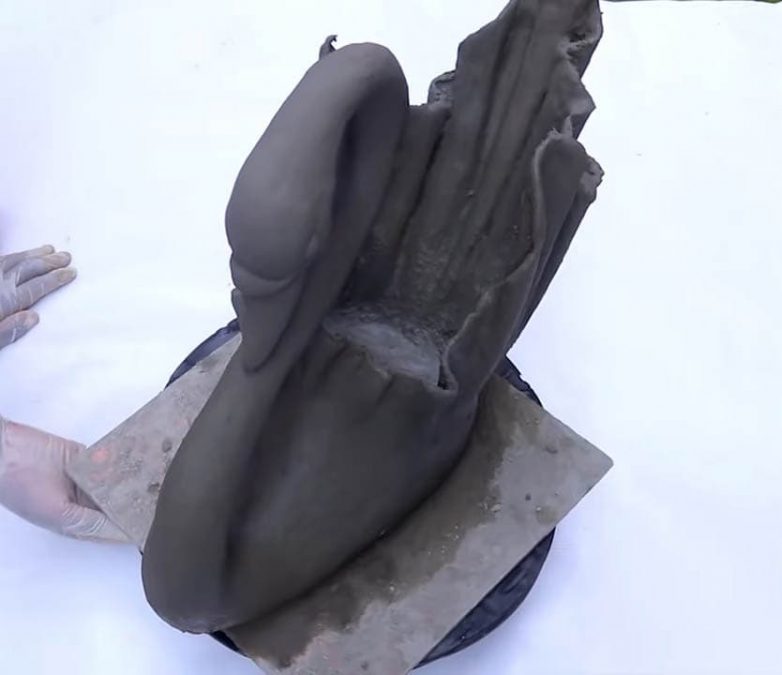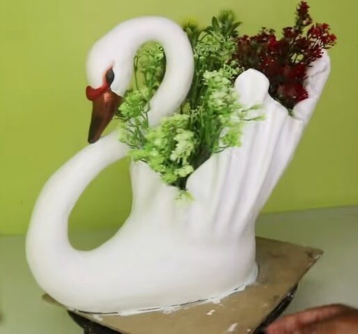 На следующие сутки объедините две заготовки вместе, добавив больше цементного раствора (он должен быть достаточно густой). Сформируйте тело лебедя, выровняйте шею и голову.