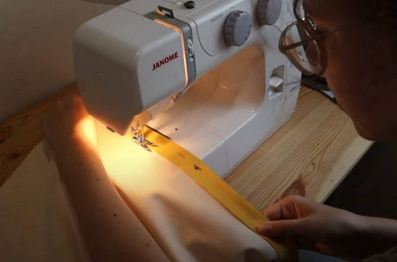 К лицевой стороне подшитой части полотна приколите нижнюю часть липучки, а затем пришейте ее на швейной машине. Липучка должна располагаться на расстоянии примерно 15 см от края полотна.