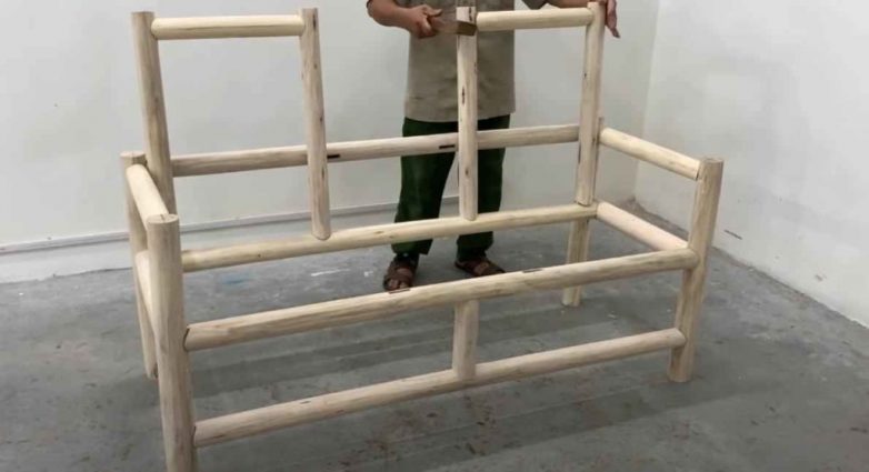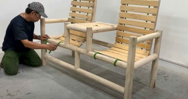 Сначала собираем две боковины скамейки. После этого соединяем их при помощи деревянных кругляков, как показано на фото.