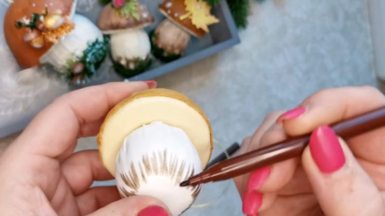 Низ грибочка украсьте линиями, сделанными коричневым фломастером.