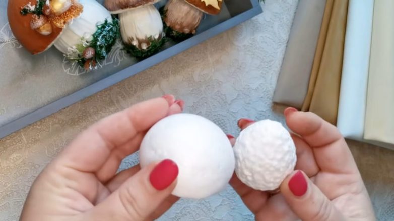 Сделаны грибочки из пенопласта. Для шляпки использована половина пенопластового шарика, а для ножки — кусочек пенопласта, вырезанный похожей формы.