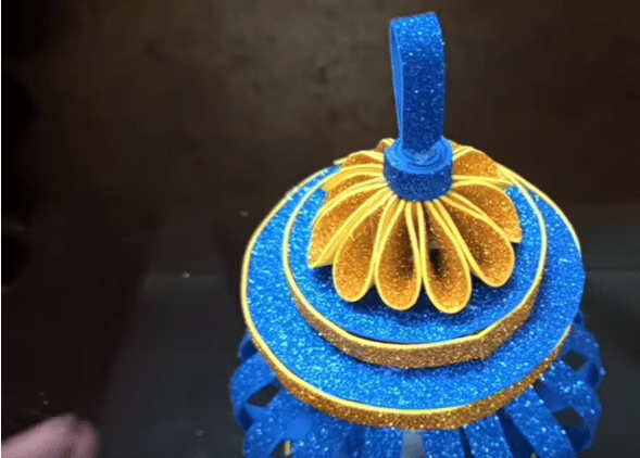 Теперь все картонные заготовки сверху и по краям обклеиваем фоамираном. Наконец можно собирать все детали вместе: на основание со свечой устанавливаем корпус-фонарик, затем сверху приклеиваем круг большего диаметра, а на него меньшего. Верхушку украшаем цветком.