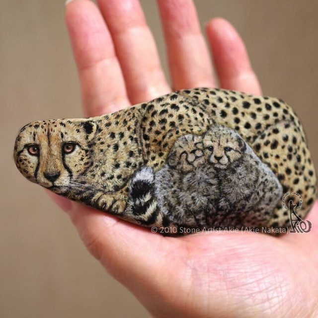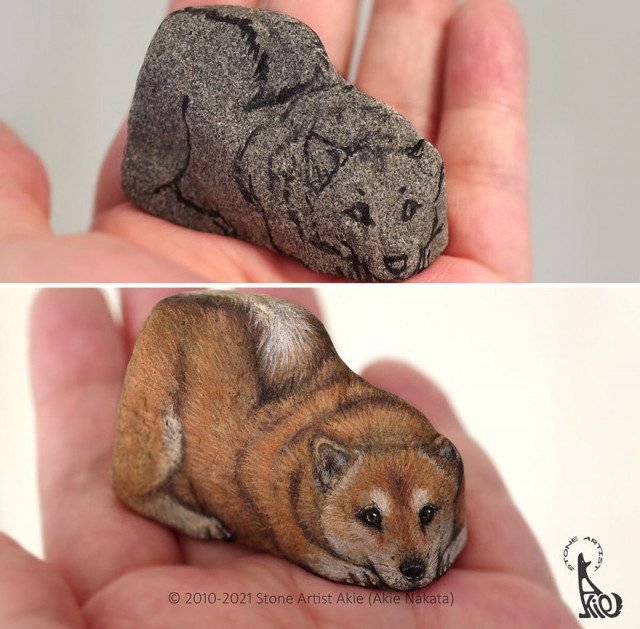 Для создания утих удивительных произведений искусства Акие использует камни, которые находит в природе. Она раскрашивает округлые камни в виде различных животных, заставляя их выглядеть так, будто это и вправду представители земной фауны.