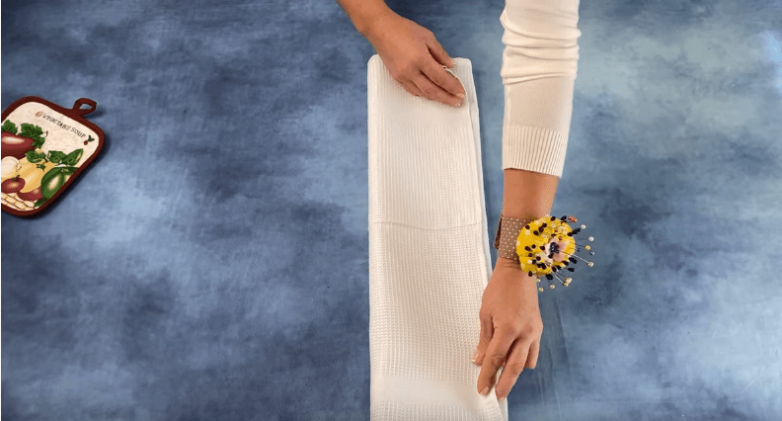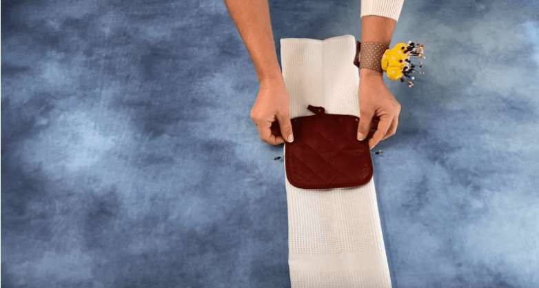 В нашем случае размер полотенца 52 см на 55 см, а размер прихватки — 16 см на 16.5 см. Выбранное полотенце разворачиваем, а затем складываем вдоль, подворачивая его края внутрь так, чтобы в сложенном состоянии получившийся прямоугольник по ширине был равен ширине прихватки.