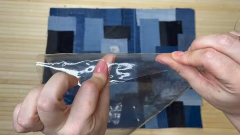 На любую плотную ткань с помощью клея-карандаша приклейте кусочки джинсовой ткани. Важный момент: кусочки должны быть либо квадратными, либо прямоугольными. Теперь понадобится виниловая плёнка. Это самая обычная скатерть, которую можно найти в хоз. магазинах. Она бывает разной плотности, но любая подходит для этого пошива.